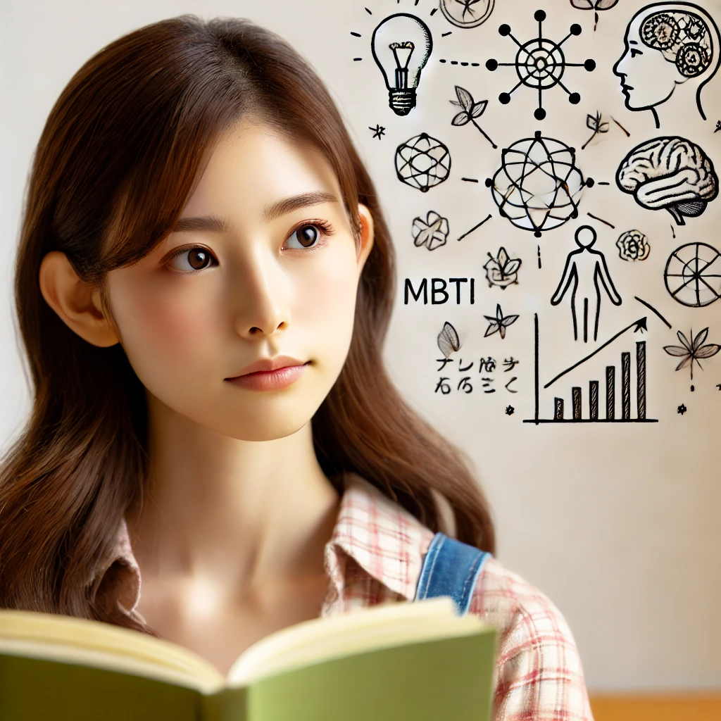 A-young-Japanese-woman-having-a-moment-of-realization-while-reading-a-book-on-MBTI.-She-looks-enlightened-and-reflective-with-illustrations-of-MBTI-c.webp